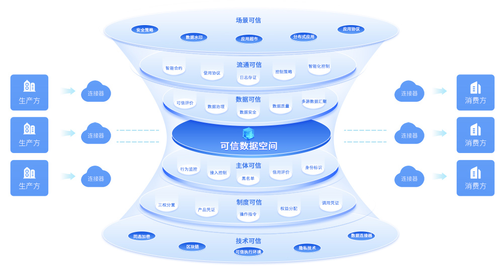 可信数据空间产品利用数据连接器、数据控制协议、隐私计算、联邦学习、存证溯源、智能合约等技术实现可信数据接入、可信数据操作、产品全过程管理、流通交易、权益分配等数据要素全过程管理,可以帮助各数据提供方全方面掌控数据的流通和应用过程,实现数据的可信流通、计量、控制和应用,构建起可控、可信、可追溯的数据流通与应用环境。