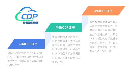 DCMM数据管理师认证(Certified DCMM Professional,CDP),是中国电子信息行业联合会(以下简称电子联合会)、工业和信息化部教育与考试中心联合推出的认证培训。是国内第一个官方认可的数据管理人员认证体系。CDP认证以数据管理领域首个国家标准《数据管理能力成熟度评估模型》(GB/T 36073-2018)(DCMM)为基准,致力于帮助企业和相关机构树立数据管理意识,提升数据管理能力,建设具有数字化基本素养的人才队伍。